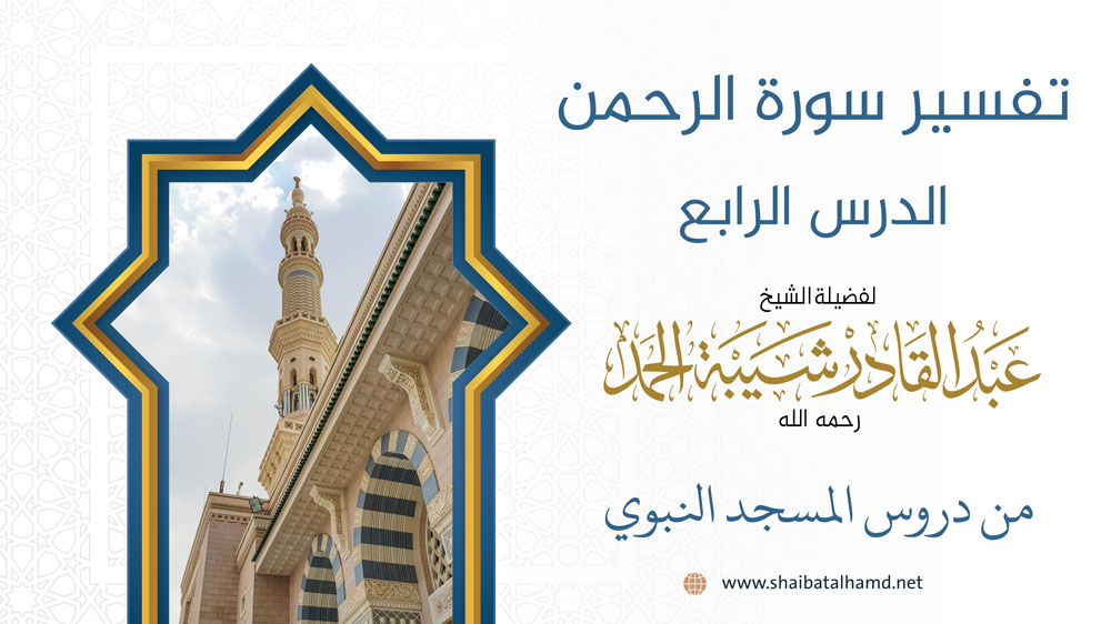 الدرس الرابع من دروس تفسير سورة الرحمن من دروس المسجد النبوي تفسير الآيات من قوله تعالى {الشمس والقمر بحسبان} الآية 5 إلى قوله تعالى {وأقيموا الوزن بالقسط ولا تخسروا الميزان} الآية 9.