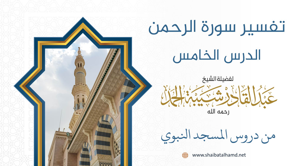 الدرس الخامس من دروس تفسير سورة الرحمن من دروس المسجد النبوي تفسير الآيات من قوله تعالى {والأرض وضعها للأنام} الآية 10 إلى قوله تعالى {فبأي آلاء ربكما تكذبان} الآية 16.