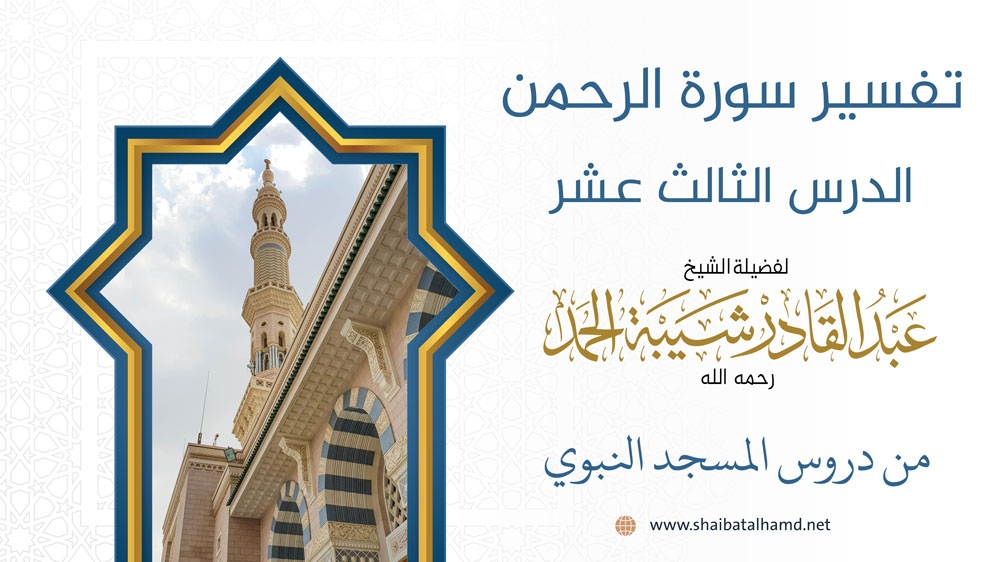 الدرس الثالث عشر من دروس تفسير سورة الرحمن من دروس المسجد النبوي تفسير الآيات من قوله تعالى {ومن دونهما جنتان} الآية 62 إلى قوله تعالى {تبارك اسم ربك ذي الجلال والإكرام} الآية 78.