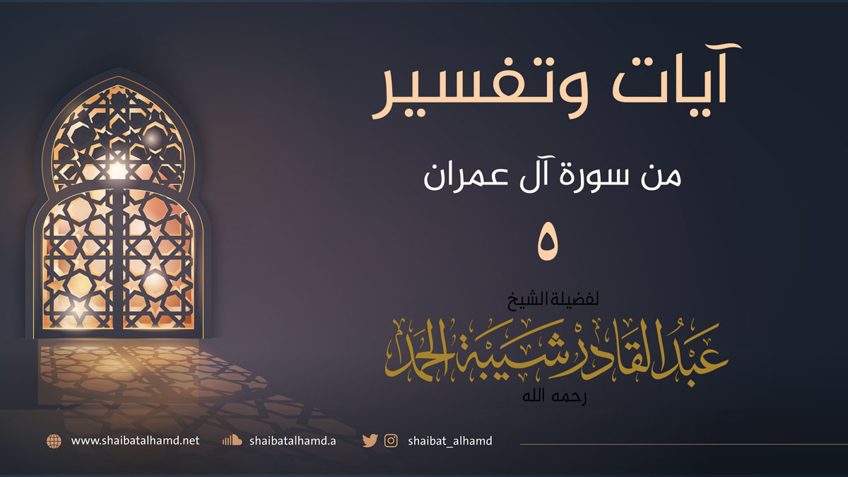 الحلقة الخامسة من برنامج آيات وتفسير من سورة آل عمران حول تفسير قوله تعالى {قل أؤنبئكم بخير من ذلكم} الآية 15 إلى قوله تعالى {شهد الله أنه لا إله إلا هو} الآية 17.