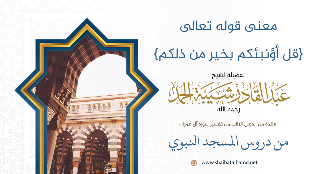 فائدة من الدرس الثالث من دروس تفسير سورة آل عمران والتي ألقيت في المسجد النبوي الشريف حول معنى قوله {قل أؤنبئكم بخير من ذلكم}.