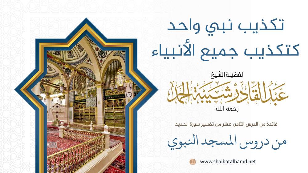 فائدة من الدرس الثامن عشر من دروس تفسير سورة الحديد والتي ألقيت في المسجد النبوي الشريف حول تكذيب نبي واحد كتكذيب جميع الأنبياء.