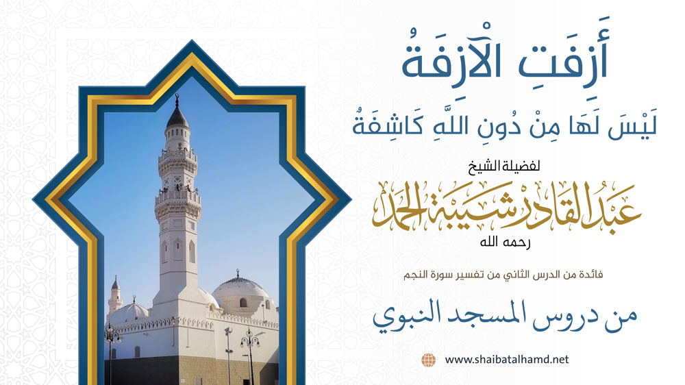 فائدة من الدرس الثاني من دروس تفسير سورة النجم والتي ألقيت في المسجد النبوي الشريف حول تفسير {أَزِفَتِ الْآزِفَةُ لَيْسَ لَهَا مِنْ دُونِ اللَّهِ كَاشِفَةٌ}.
