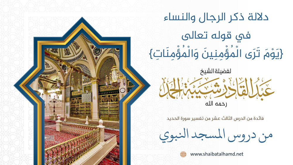 فائدة من الدرس الثالث عشر من دروس تفسير سورة الحديد والتي ألقيت في المسجد النبوي الشريف حول دلالة ذكر الرجال والنساء في قوله: {يَوْمَ تَرَى الْمُؤْمِنِينَ وَالْمُؤْمِنَاتِ}.