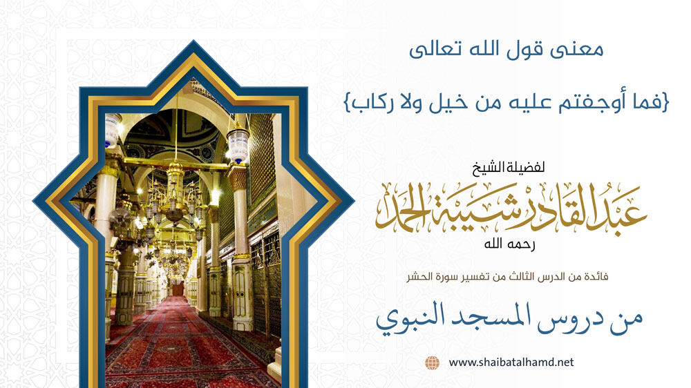 فائدة من الدرس الثالث من دروس تفسير سورة الحشر والتي ألقيت في المسجد النبوي الشريف حول معنى: {فما أوجفتم عليه من خيل ولا ركاب}.