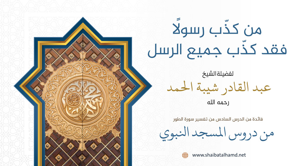 فائدة من الدرس السادس من دروس تفسير سورة الطور والتي ألقيت في المسجد النبوي الشريف حول أن من كذّب رسولًا فقد كذّب جميع الرسل.