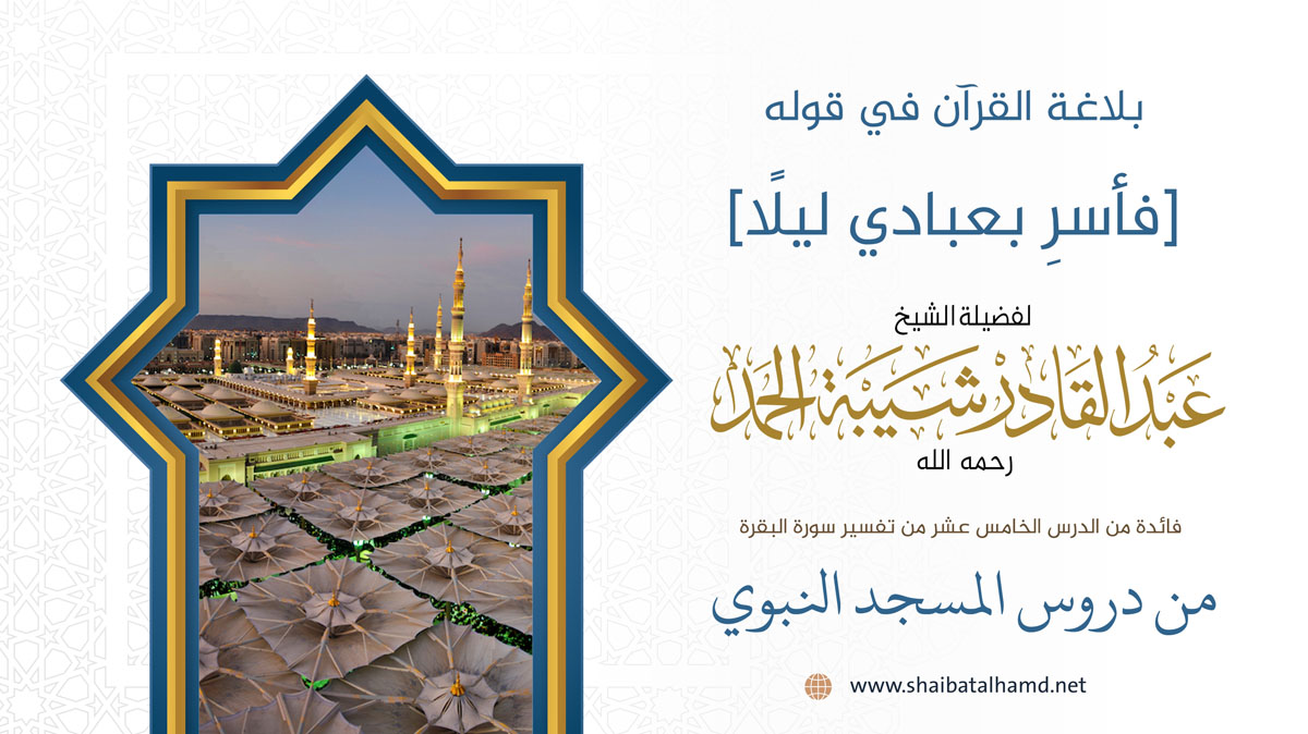 فائدة من الدرس الخامس عشر من دروس تفسير سورة البقرة والتي ألقيت في المسجد النبوي الشريف بلاغة القرآن في قوله {فأسرِ بعبادي ليلًا}.