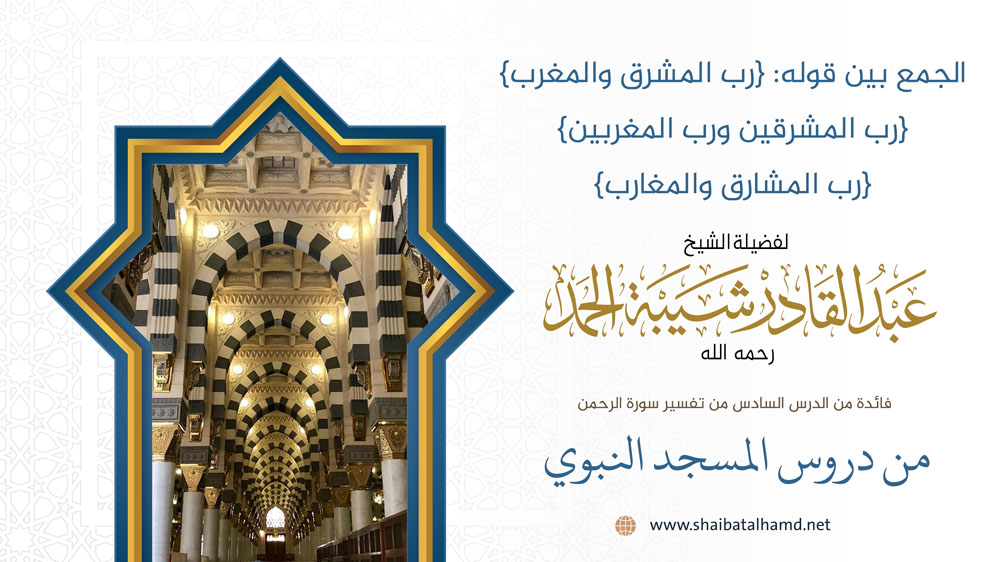فائدة من الدرس السادس من دروس تفسير سورة الرحمن والتي ألقيت في المسجد النبوي الشريف حول الجمع بين قوله: {رب المشرق والمغرب} {رب المشرقين ورب المغربين} {رب المشارق والمغارب}.